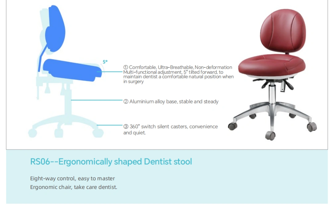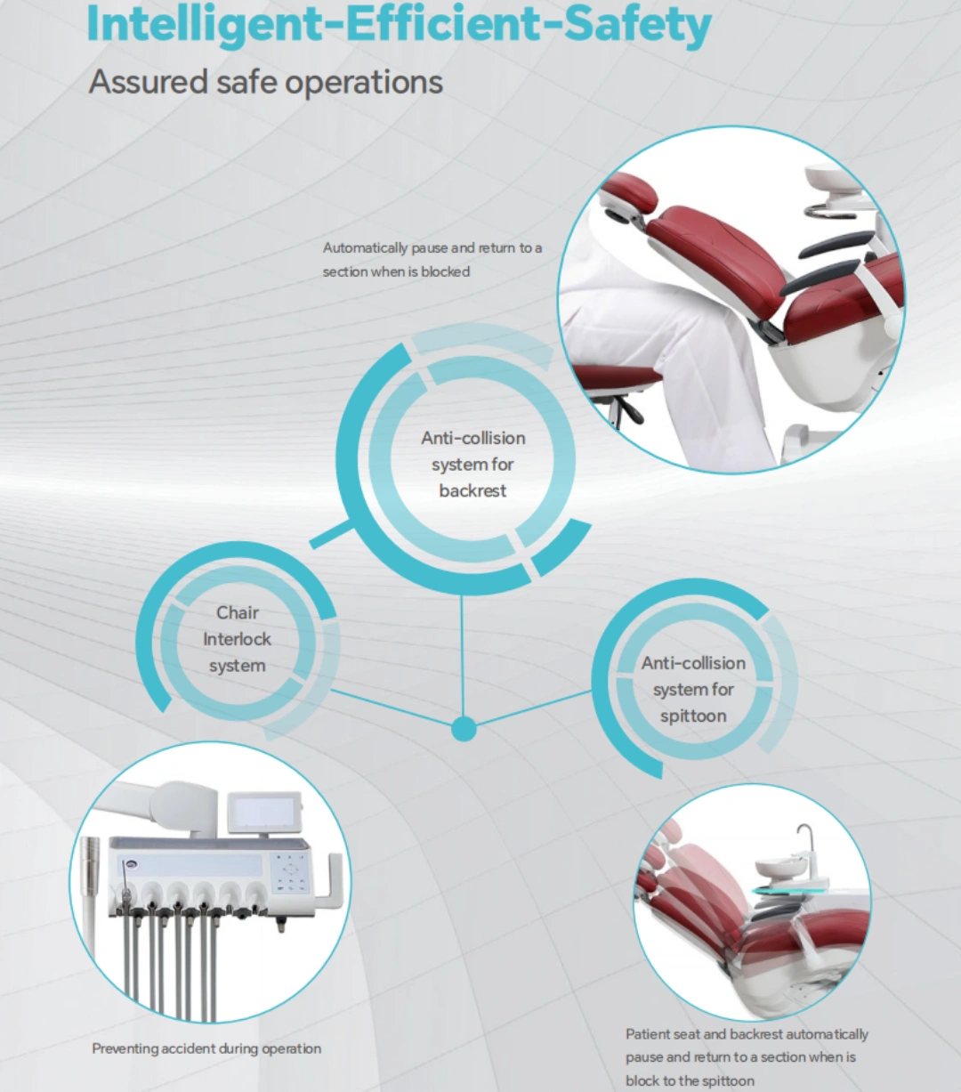 6. This dental chair unit adopts Anti-collision system for backrest, so its backrest automatically pause and return to a section when block occurs.