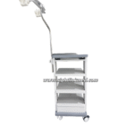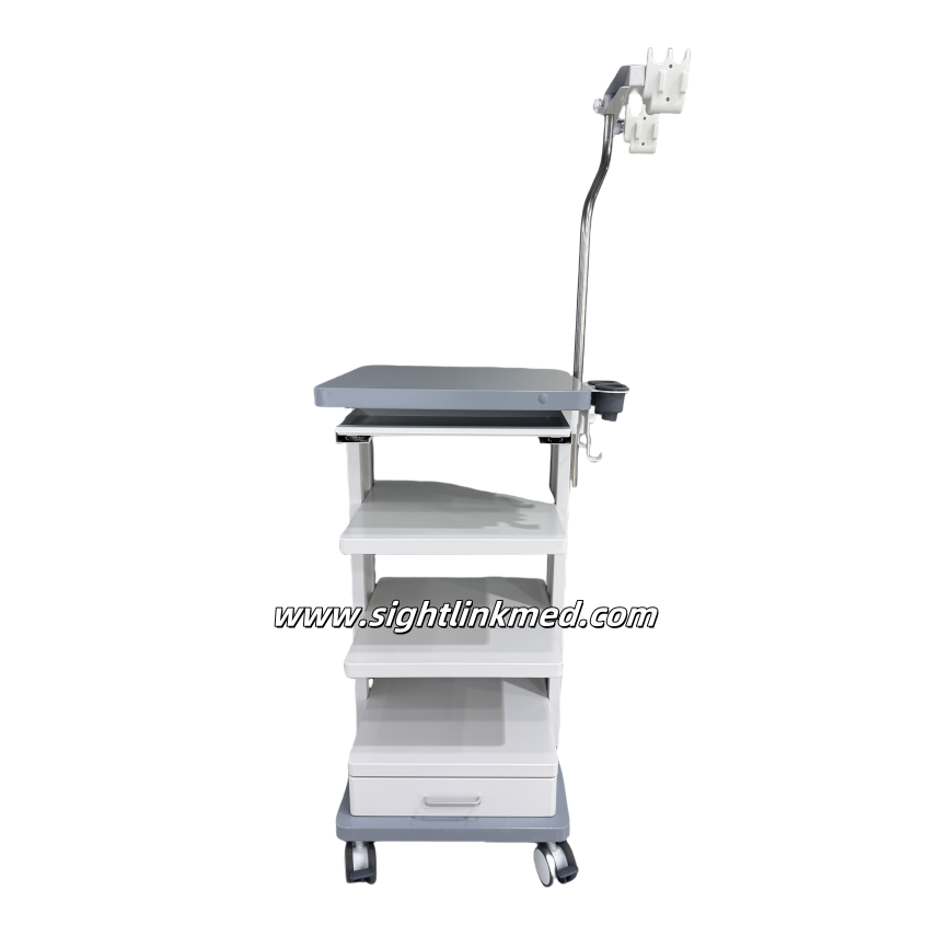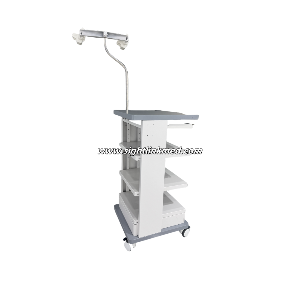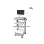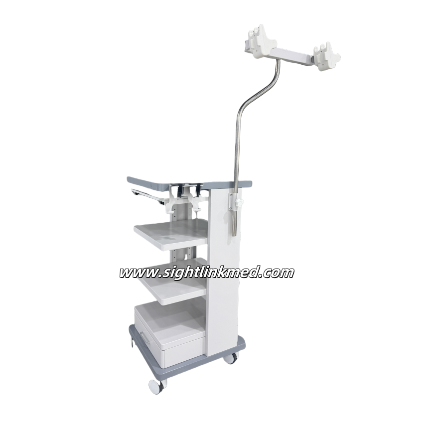 This Endoscopic Cart is equipped with a arm, a keyboard and mouse support bracket, a mouse shelf, a telescopic infusion rod (two hooks), three cable rack (U shape) and three equipment pallets.